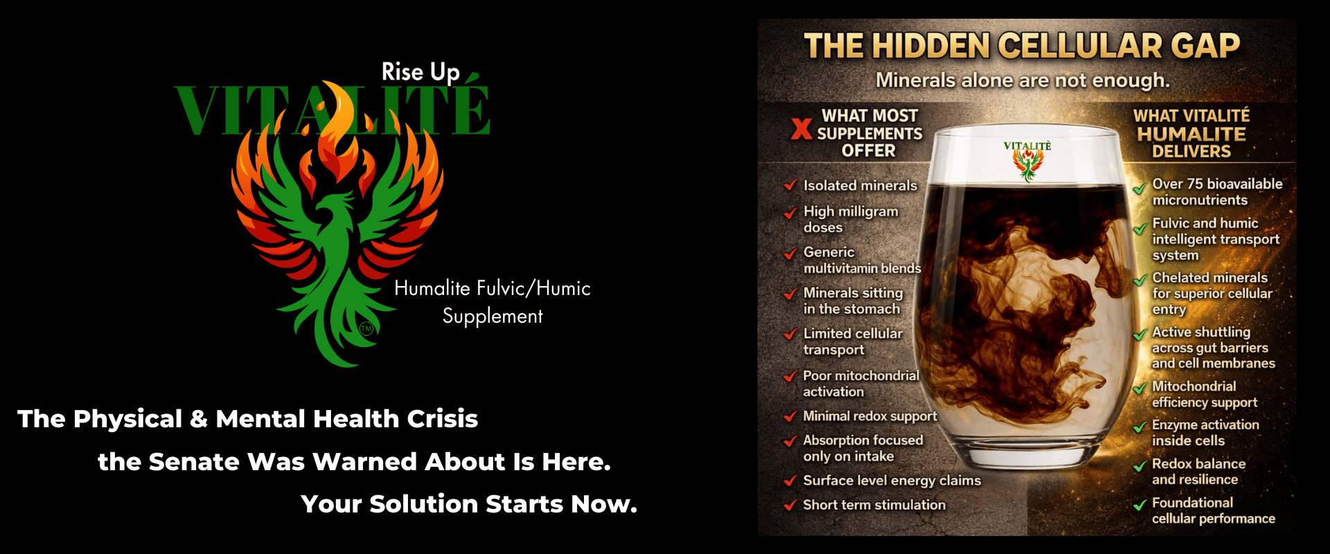 Vitalité Humalite contains a natural spectrum of ionic trace & major minerals bound within fulvic/humic complexes. Actual mineral presence and levels may vary due to natural source variability.